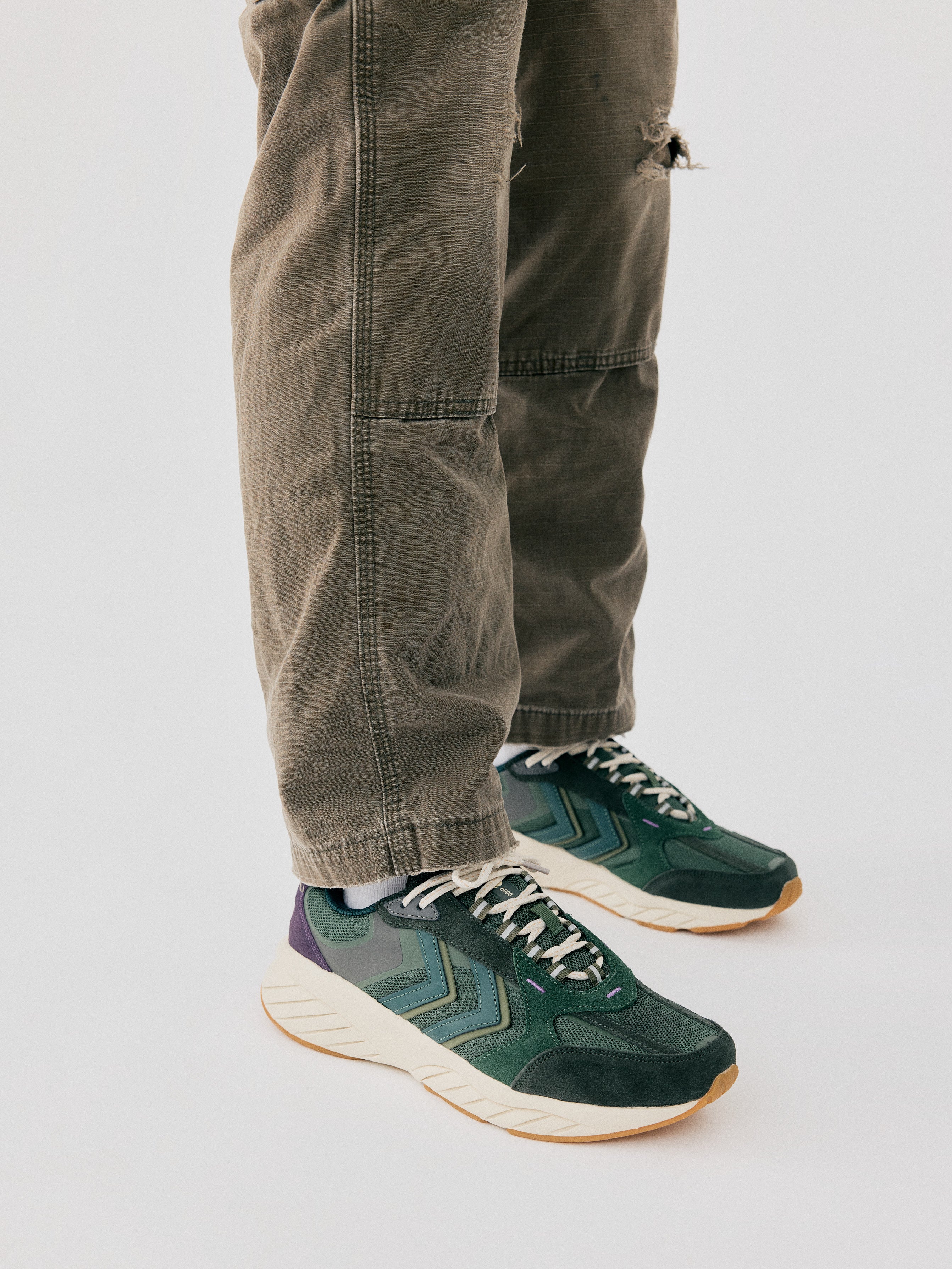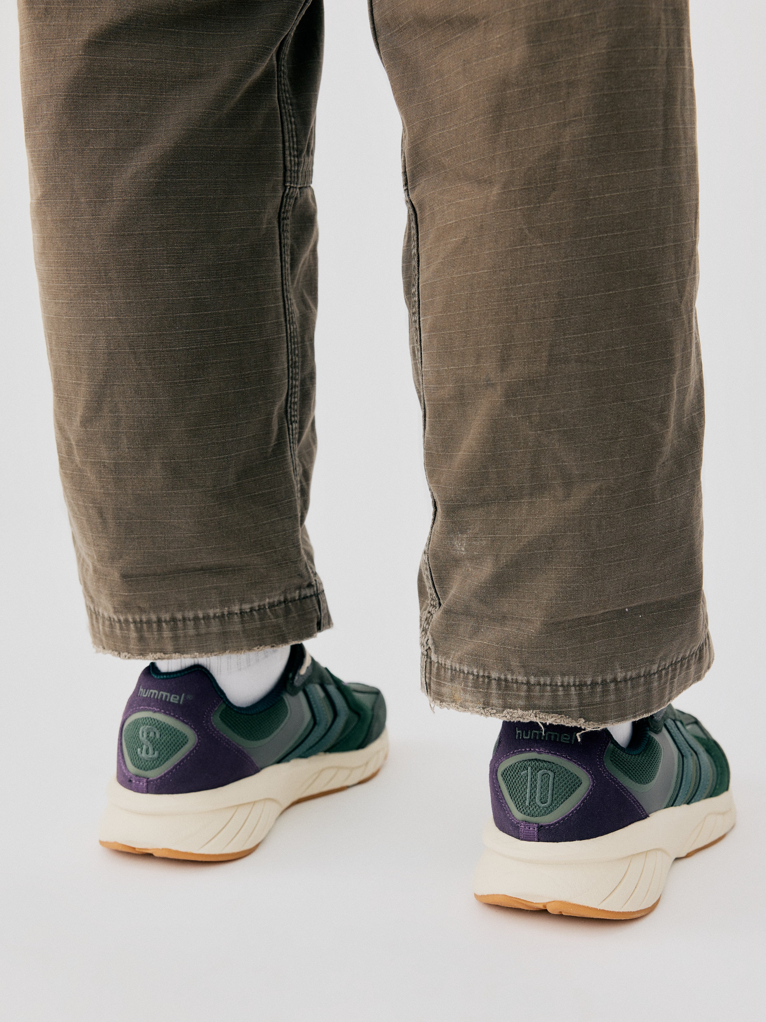 Sneakeren leveres med en overdel i premium ruskind i forskellige nuancer af grøn og med en lilla kontrastfarve på hælen. Den fuldendes af en klassisk ydersål i rågummi, som er en reference til Hummels indoor originals. Derudover er venstre hælkap broderet med vores SC-logo og højre hælkap er broderet med tallet 10, og den leveres i en smuk kasse med dust bag, ekstra snørebånd og et monogram-tørklæde.