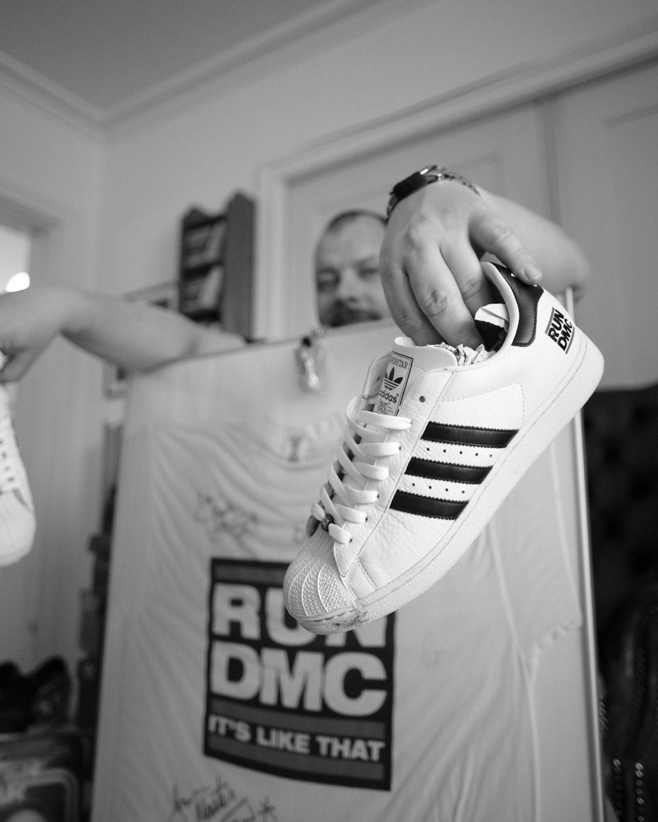 Man er ikke i tvivl om, at man er på besøg hos en vaskeægte samler, når man træder ind i Thomas’ lejlighed. Han åbner døren iført en Adidas t-shirt, og i entreen står flere par Superstars på rad og række. I gangen hænger en indrammet t-shirt, hvor der, foruden tre skæve og krøllede tuschstreger, med printede versaler står ”RUN DMC”... men mere om det senere.