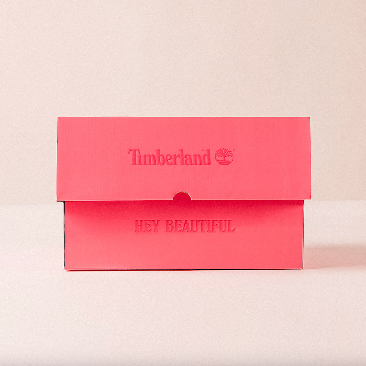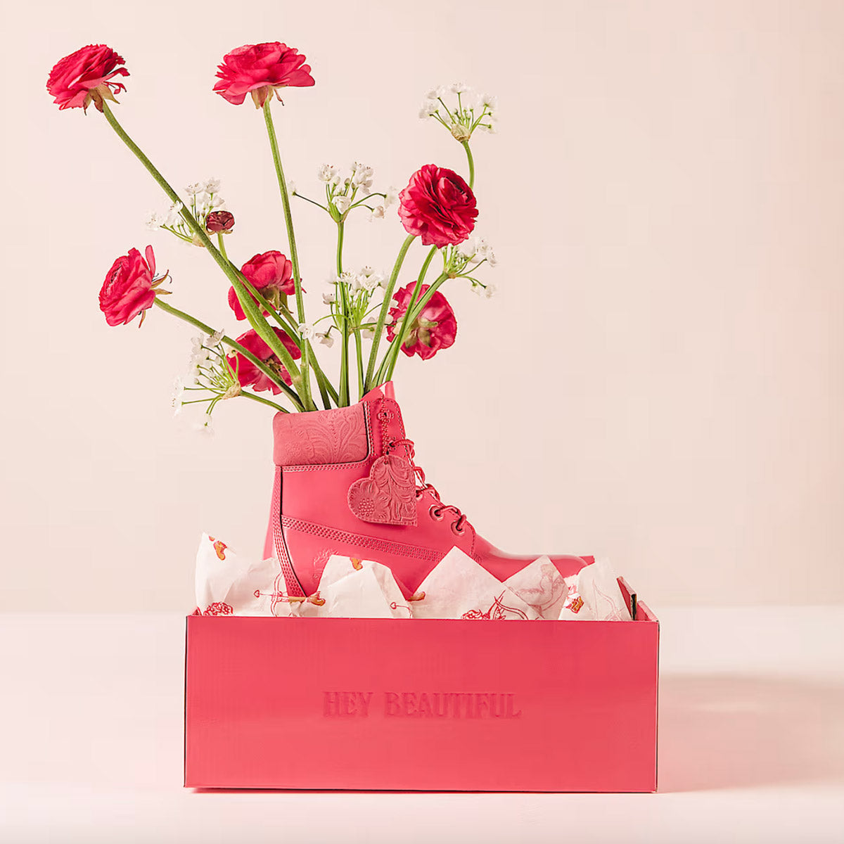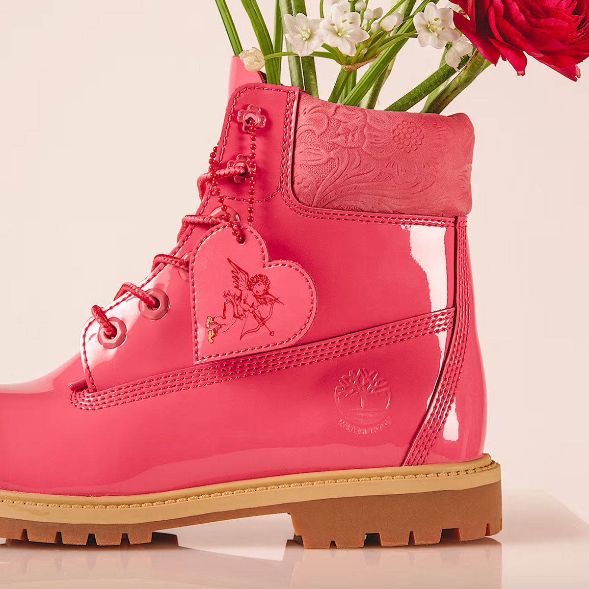 Den ikoniske 6 Inch støvle fra Timberland kommer i en flot lyserød med smukke blomsterdekorationer langs anklen og et fint hjerteformet tag i anledning af Valentines Dag.