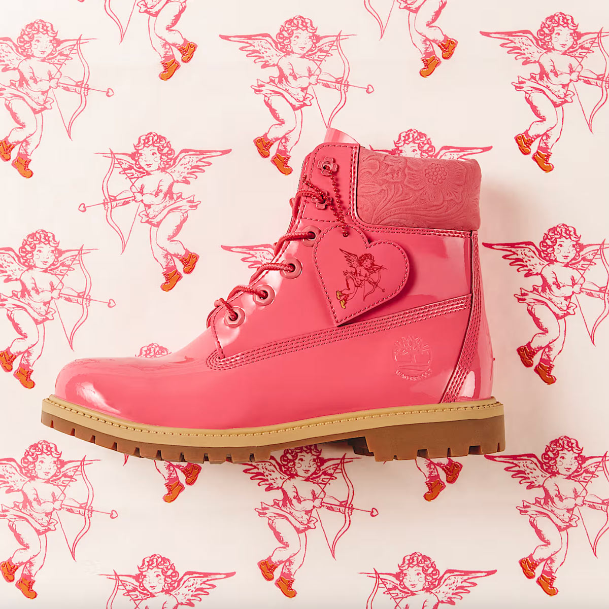 Den ikoniske 6 Inch støvle fra Timberland kommer i en flot lyserød med smukke blomsterdekorationer langs anklen og et fint hjerteformet tag i anledning af Valentines Dag.