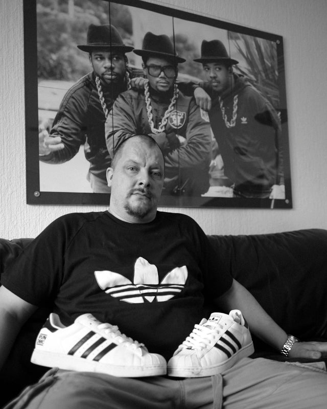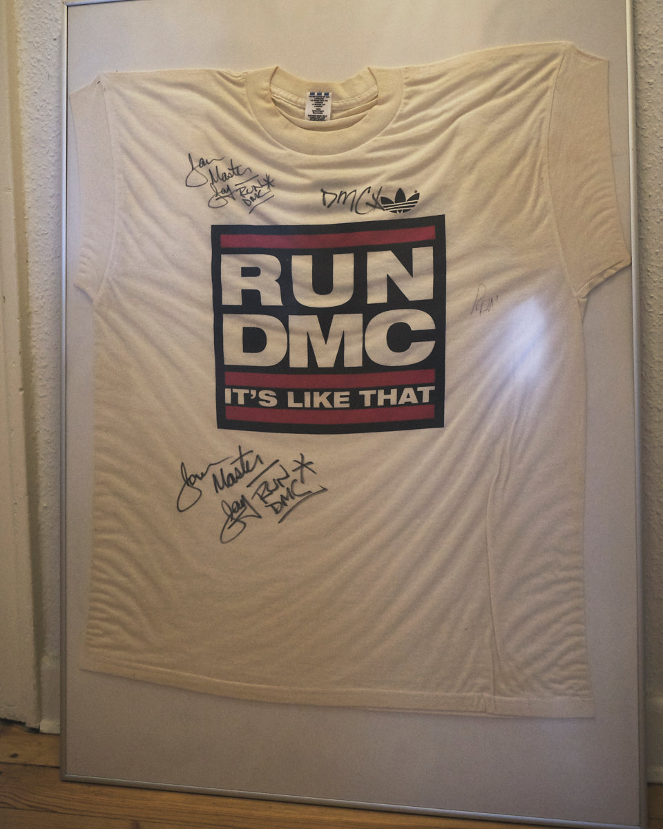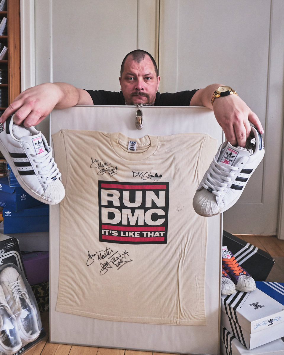 Man er ikke i tvivl om, at man er på besøg hos en vaskeægte samler, når man træder ind i Thomas’ lejlighed. Han åbner døren iført en Adidas t-shirt, og i entreen står flere par Superstars på rad og række. I gangen hænger en indrammet t-shirt, hvor der, foruden tre skæve og krøllede tuschstreger, med printede versaler står ”RUN DMC”... men mere om det senere.