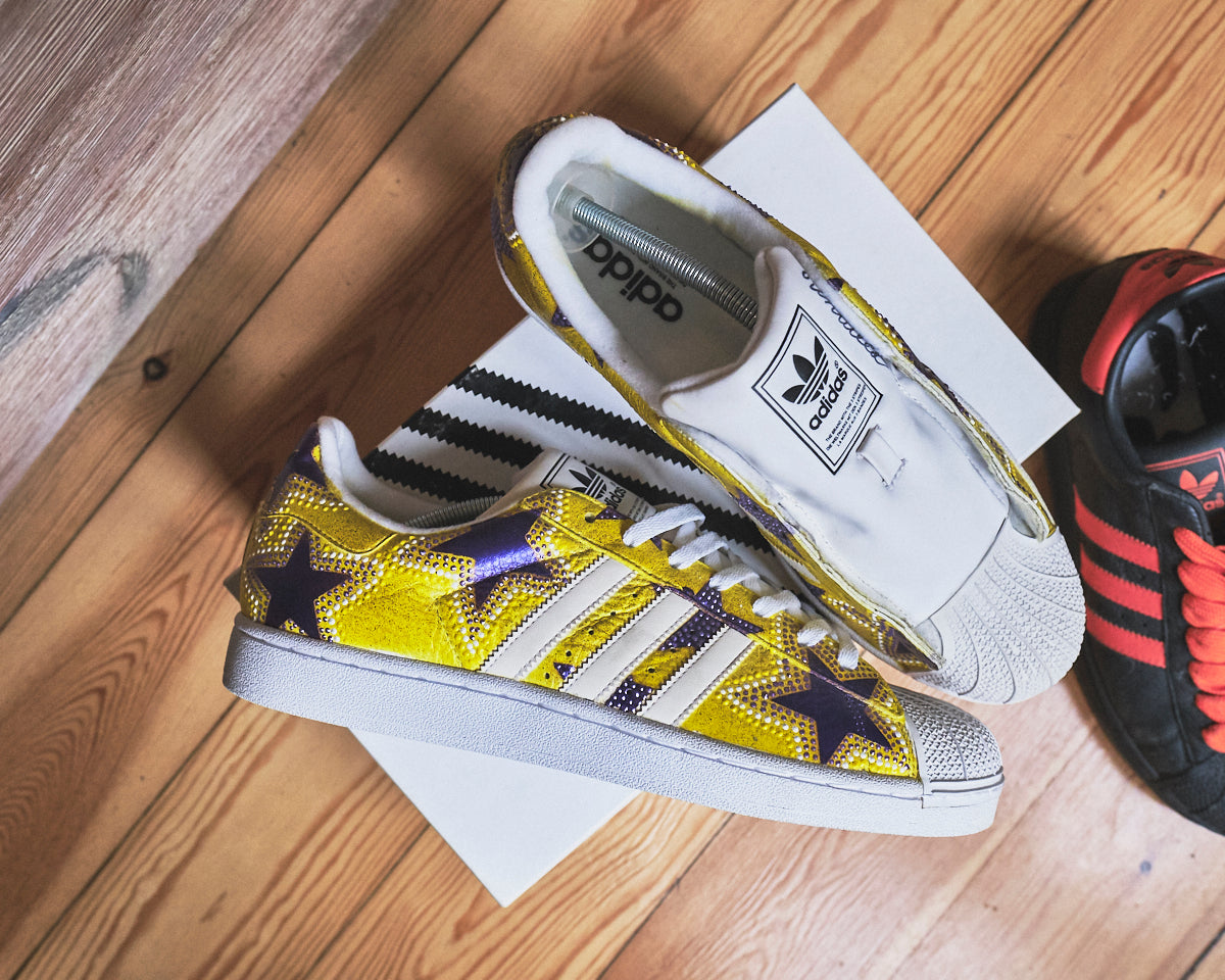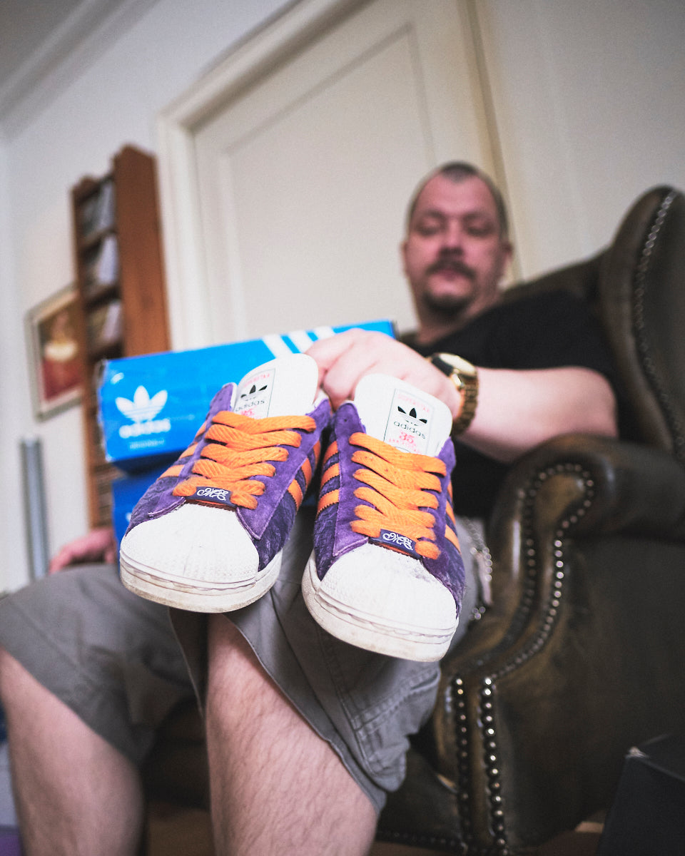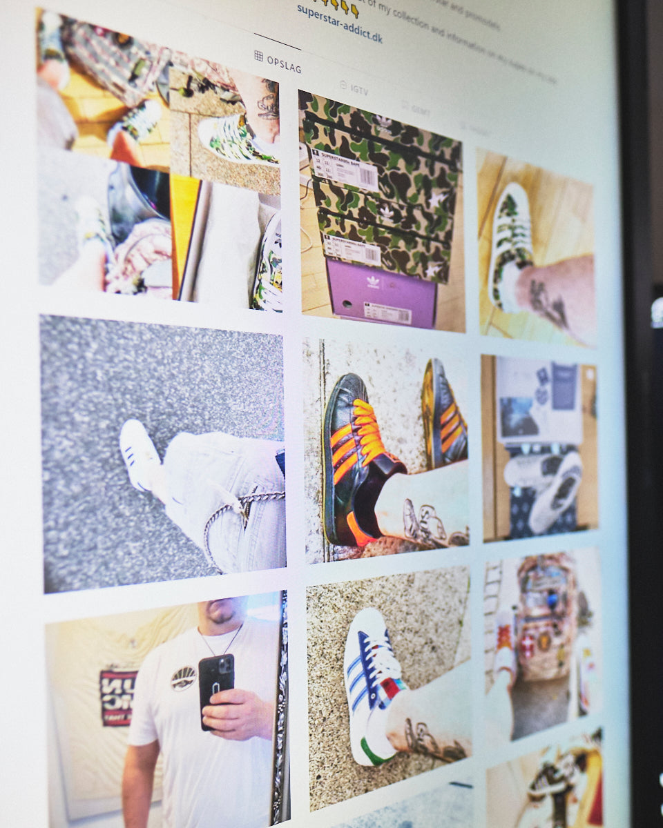 Og herfra tager historien lidt af et kvantespring. Vi skal kvartvejs rundt om jorden; tilbage til Smilets By på en solskinsrig junidag. Selvom det kan være svært at få øje på fællesnævneren mellem en Run-D.M.C. koncert i New York i 1985 og Aarhus i 2021, er der alligevel noget, der knytter de to sammen. Kærligheden til Adidas’ ikoniske Superstar lever nemlig i bedste velgående i en treværelses lejlighed på Trøjborg i Aarhus. Her bor Superstar Thomas – og det er ikke uden grund, at han har fået det navn. Thomas er indehaver af mere end 100 Superstars… og har sågar fået tatoveret den ikoniske gummisko på læggen. Da vi lidt over middagstid ankommer til adressen, sidder Thomas nonchalant med fødderne ud over sin altan og vinker til os, da vi parkerer cyklerne.