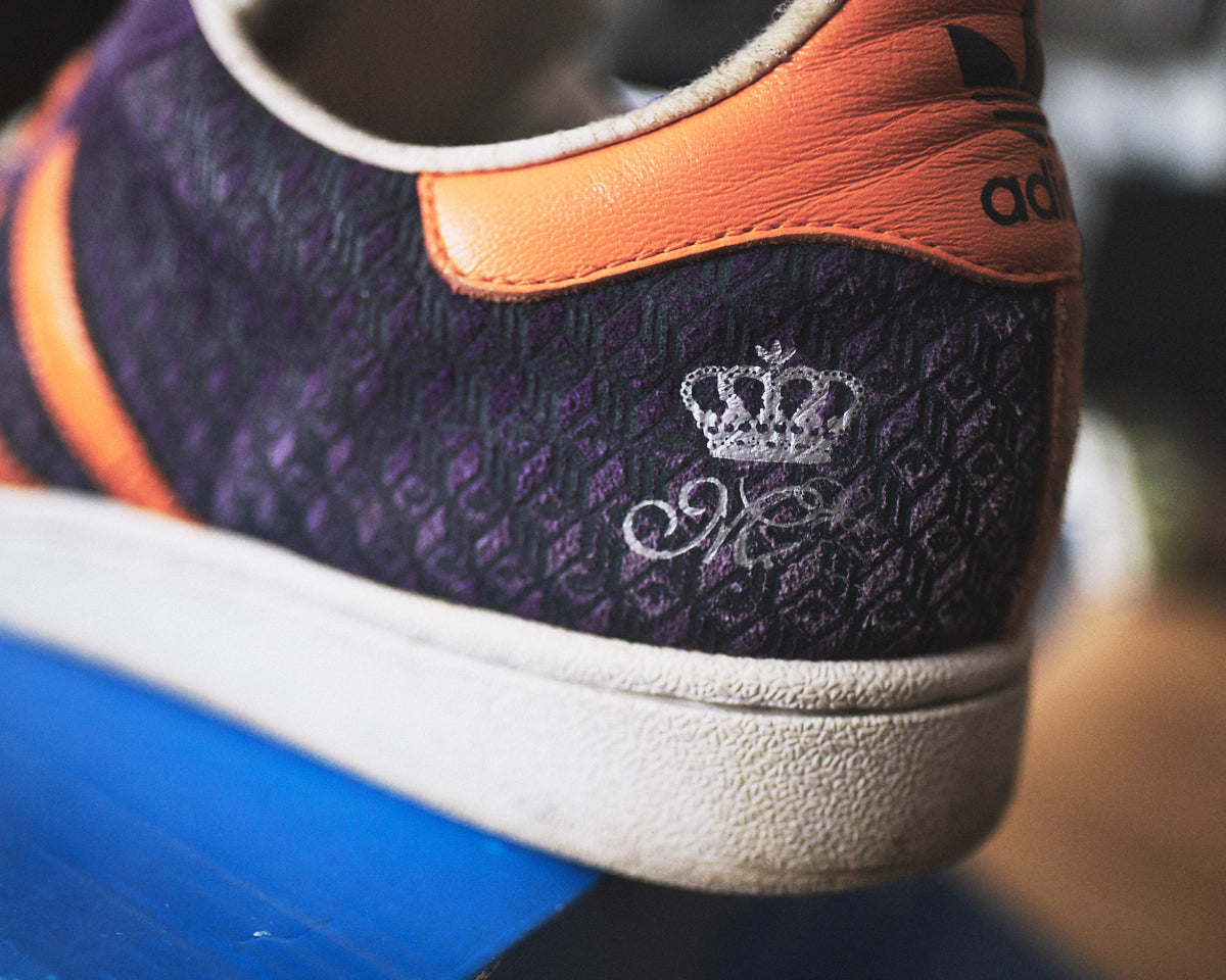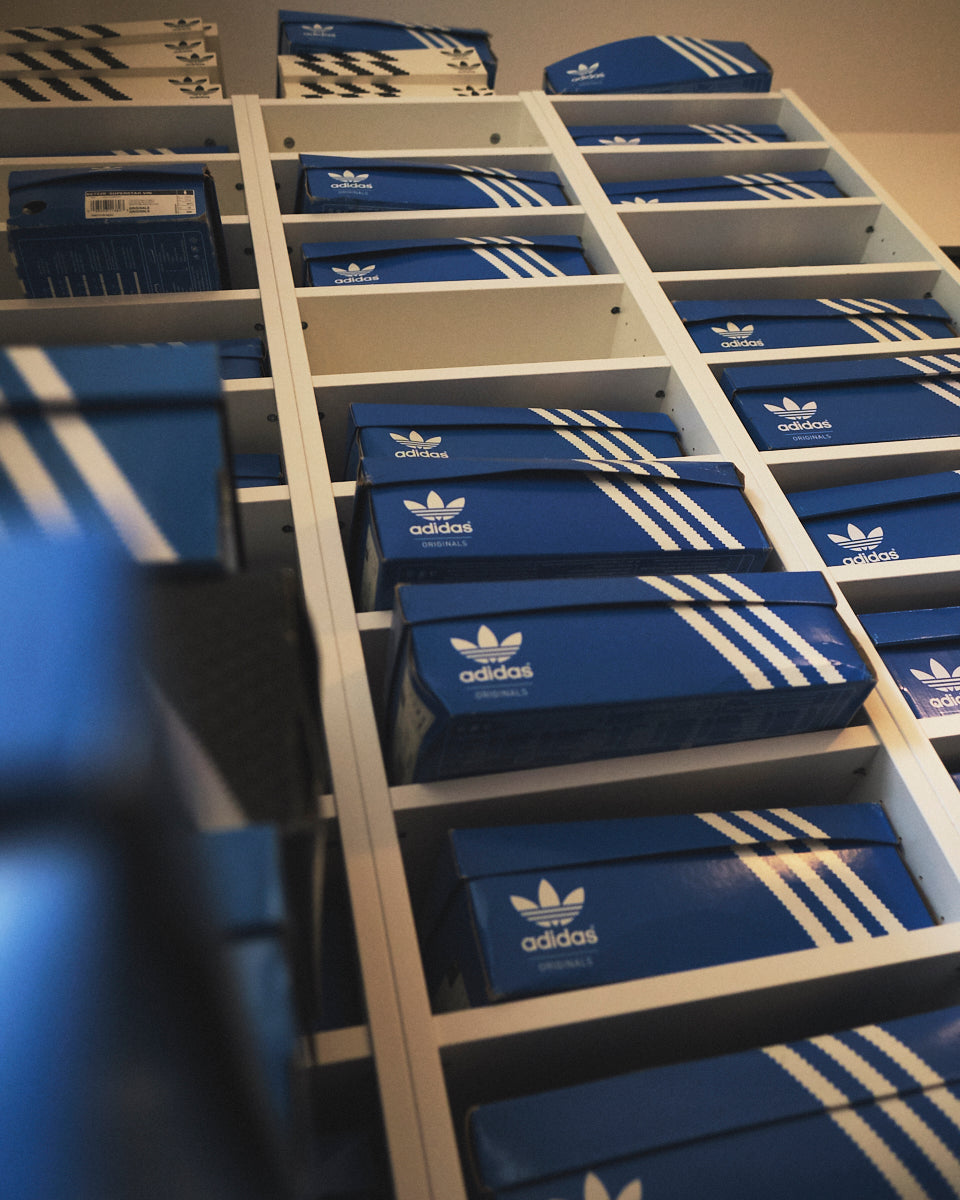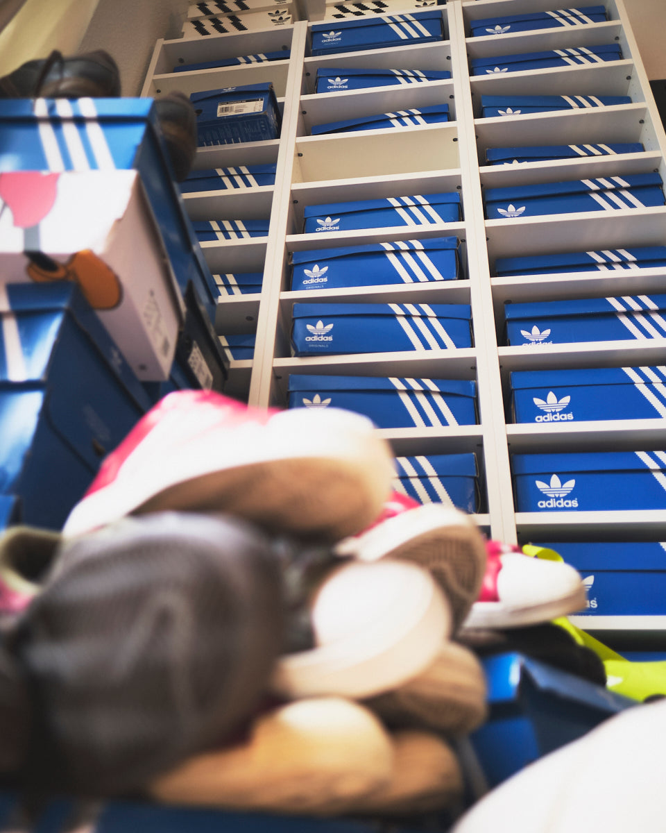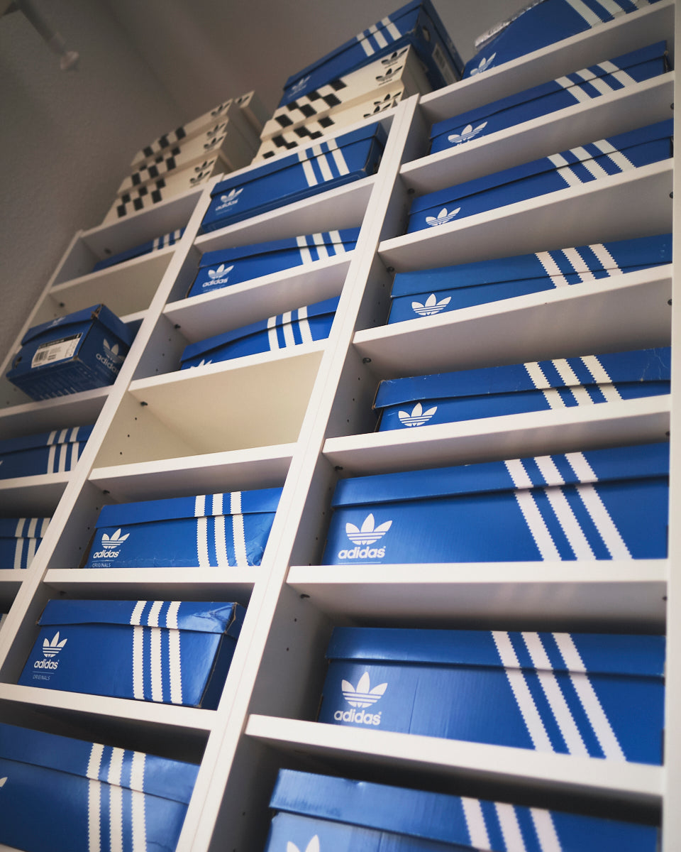 Siden da har Thomas' samling kun vokset sig større, og endevæggen i soveværelset tæller adskillige blå og hvide skoæsker fra top til bund; faktisk så mange, at flere af dem er havnet på gulvet med noget der ligner en planlagt tilfældighed. Den unikke, og lettere subtile, udsmykning af parketgulvet bryder med sirligheden i måden de øvrige kasser er organiseret, men fungerer omvendt som et eksemplarisk billede på omfanget af Thomas’ samling. Samtlige af parrene har vi aldrig hverken set eller hørt om før. Sjældne og unikke - præcis ligesom historierne, der knytter sig til dem. Thomas hiver et par gule og lilla, pallietbeklædte Superstars frem fra mængden, hvoraf den ene sko mangler snørebåndene.
