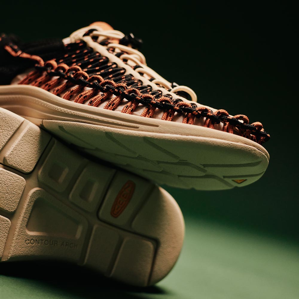 Keen UNEEK her i samarbejde med END. Grundlagt i 2005 af Christian Ashworth og John Parker blev END. skabt gennem en fælles passion for mode, design, kunst og musik. Over 10 år efter Rory Fuerst Jr. satte sig for at skabe den første open-air sneaker, har KEEN teamet op med END. for at bringe dig UNEEK ‘Camping’ - en fejring af at undslippe byen og fordybe sig i naturen. Skabt med genbrugte elastiske snore, der tillader fri bevægelighed, er det farvepaletten, vi ikke kan få nok af. Mørkere toner afspejler skovens æstetik, mens de orange nuancer er inspireret af solopgange, solnedgange og hyggelige lejrbål. Den kommer her i en flot Black/Hazel farvekombination, med sit unikke to-snor system og en justerbar pasform der sikrer komfort for enhver fod. Du kan sikre dig et par ved at skrive dig op her!